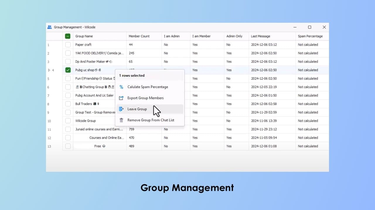- Group ManagementLeave group in bulk, Calculate spam percentage, Export member list from multiple groups