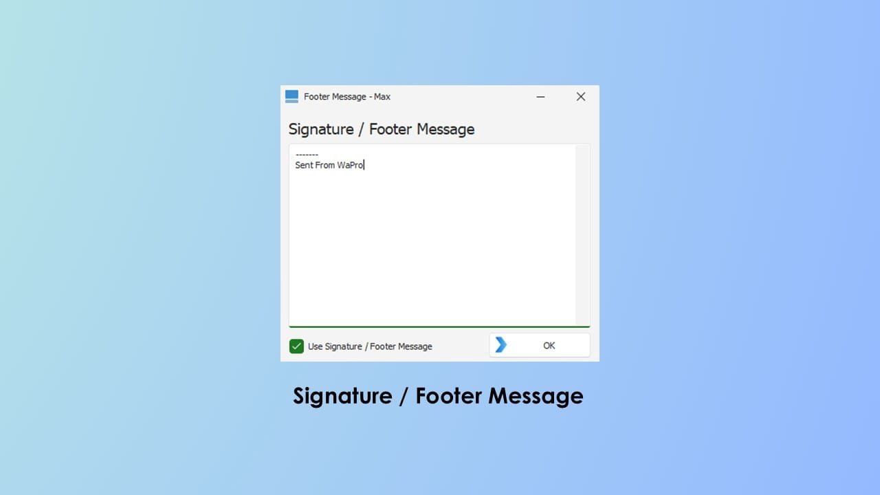 - Footer MessageSet a signature message / footer message for each sent message. If you have two employees using the same WhatsApp account, you can set up message signatures to identify who sent each message